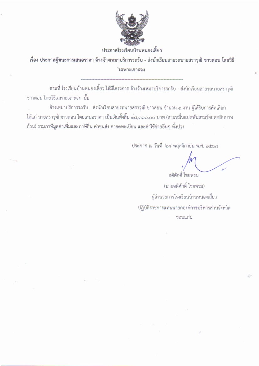 ประกาศผู้ชนะการเสนอราคา จ้างเหมาบริการรถรับ - ส่งนักเรียนสายรถนายสราวุฒิ ชาวดอน โดยวิธีเฉพาะเจาะจง